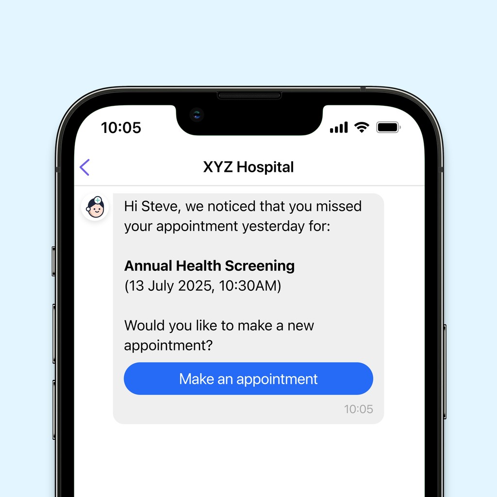 Send smart follow-ups to recover missed appointments and nudge patients to return for scheduled screenings or care.
